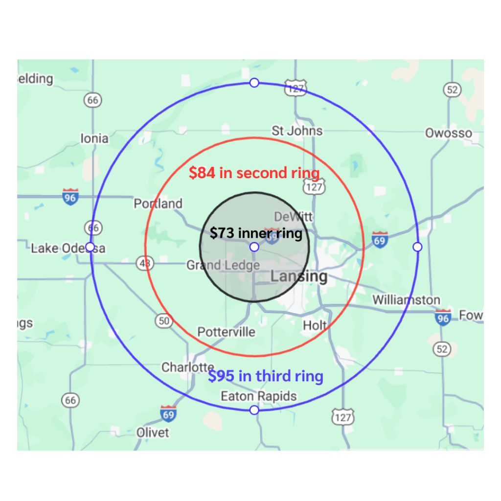 Pet reiki costs $73-95 (cash discount available) and covers travel within the service area map. (See below.) There are three service area rings that increase in cost the farther out you live. Please ask if you are unsure which service area ring you are in during the pet reiki discovery call.